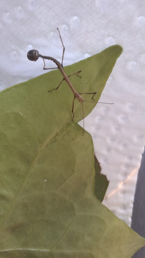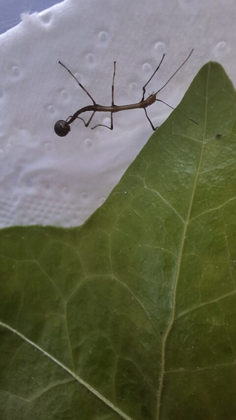 Dans la classe, nous avons donc 3 grands phasmes et 1 tout petit. Il vient de naitre, et il avait d’ailleurs l’œuf accroché à une de ses pattes.